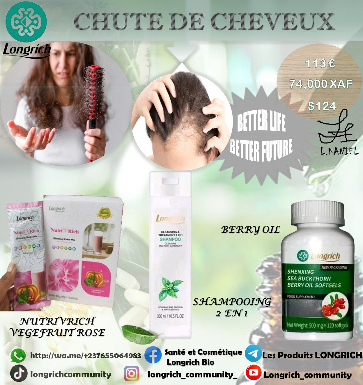 Transformez vos cheveux avec le Traitement Longrich Contre la Chute de Cheveux. Commandez dès aujourd’hui et découvrez une solution naturelle et innovante pour retrouver une chevelure forte, dense et éclatante de santé ! 🌿