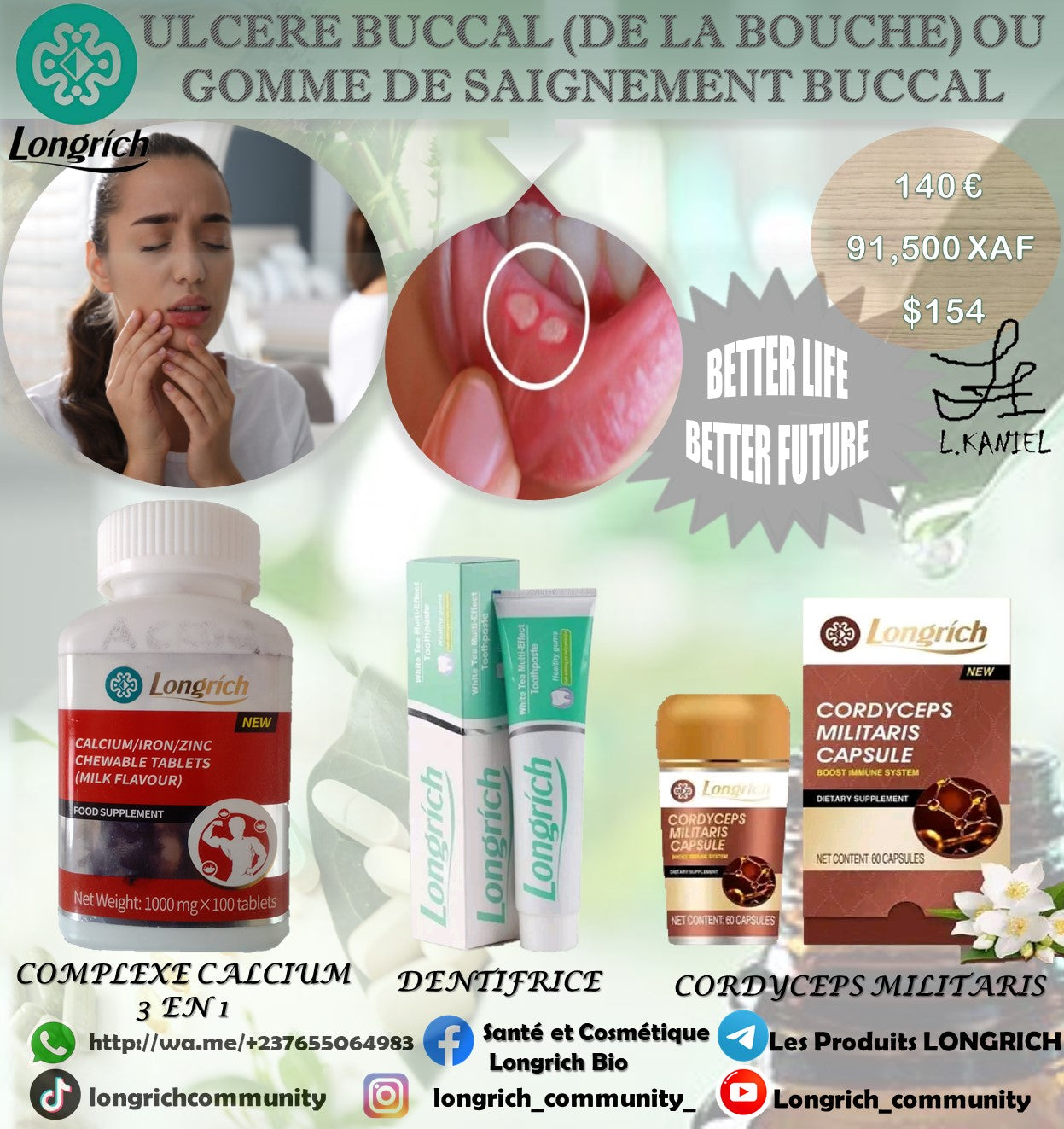 Prenez soin de votre santé buccale avec le Traitement Longrich Contre l’Ulcère Buccal et Gomme de Saignement Buccal. Commandez dès aujourd’hui et découvrez une solution naturelle pour améliorer votre confort et retrouver une bouche saine au quotidien ! 🌿